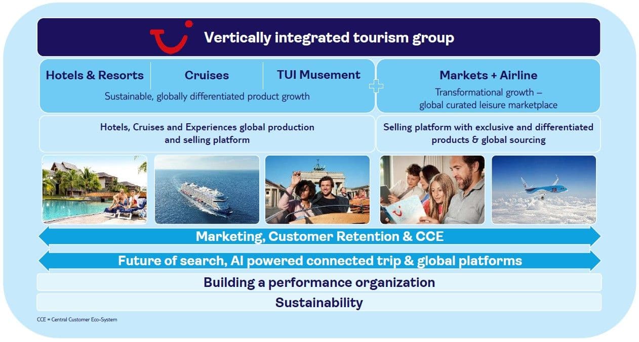 Our unique business model focuses on integration and differentiation across Holiday Experiences and Markets + Airline. Our strategy is embedded in one central customer ecosystem, underpinned by our Sustainability Agenda and by our people. We are accelerating profitable growth by maximising customer lifetime value and leveraging synergies using our Markets + Airline distribution powerhouse to drive superior performance in Holiday Experiences. We are transforming TUI into a scalable, platform-based global curated leisure marketplace, offering more products to more customers through integrated brands. We are building a more agile, cost-efficient business with higher speed to market, delivering additional shareholder value.