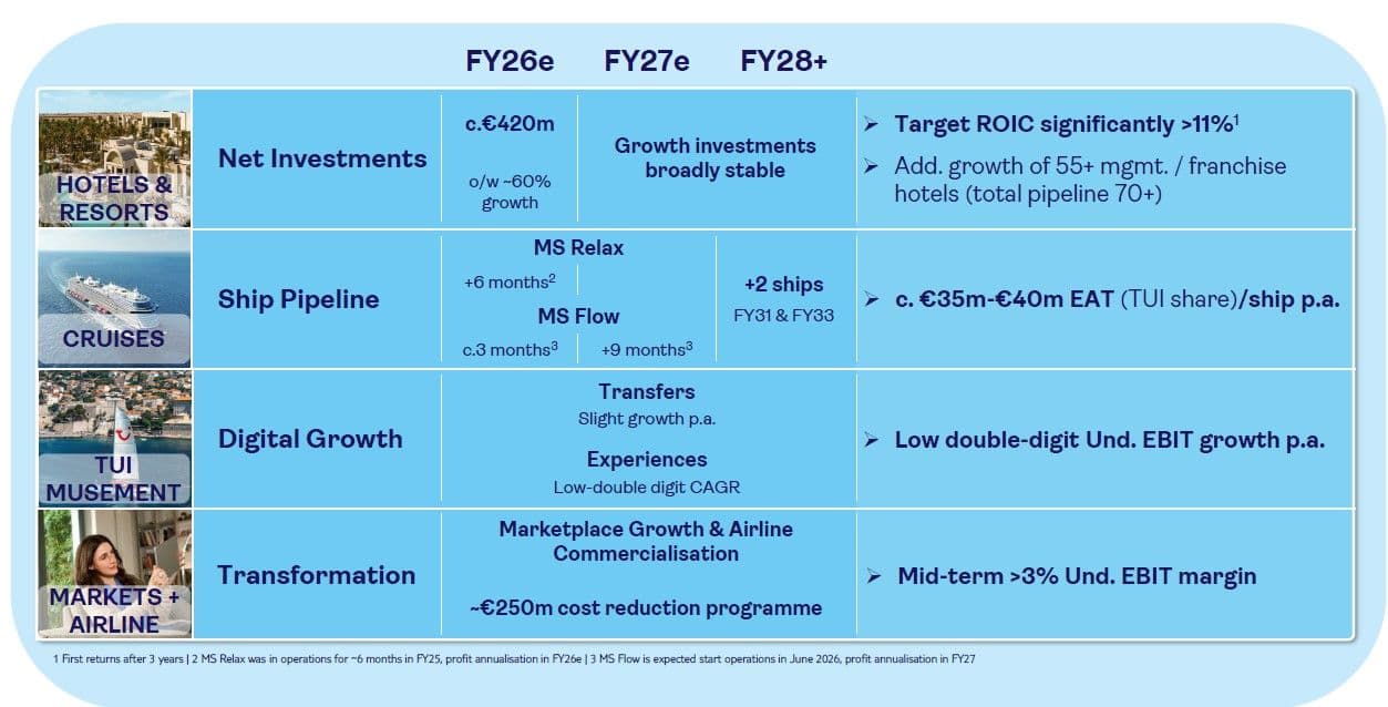 We remain firmly committed to our capital allocation framework. Our focus is on driving profitable growth and improving cash flow through organic growth, disciplined investment and portfolio optimisation. Our disciplined investment strategy for FY26e includes net investments of €860m to €900m. Over 60% of Hotels & Resorts investments will be directed into growth, especially in RIU and Robinson and be fuelled by vertical integration. We are also strengthening competitiveness in Markets + Airline through fleet modernisation with B737 MAX aircraft, alongside investments in Cruises (Marella Cruises), IT and other strategic areas. We expect investments from FY27 onwards to be broadly in line with FY26e levels, subject to Boeing deliveries and financing.