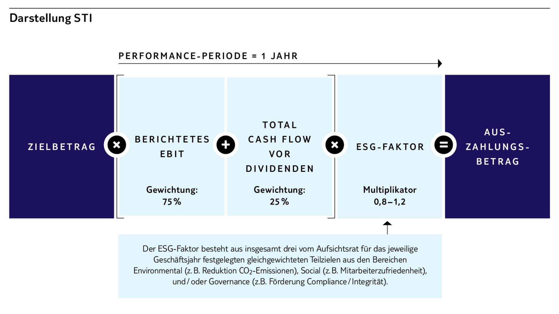 Zu den erfolgsabhängigen Komponenten der Vorstandsvergütung gehören zum einen die Jahreserfolgsvergütung (STI), mit einem einjährigen Leistungszeitraum, die auf Grundlage von zwei finanziellen Konzernkennzahlen und einem sogenannten ESG-Faktor (ESG = Environmental, Social, Governance) bemessen wird.