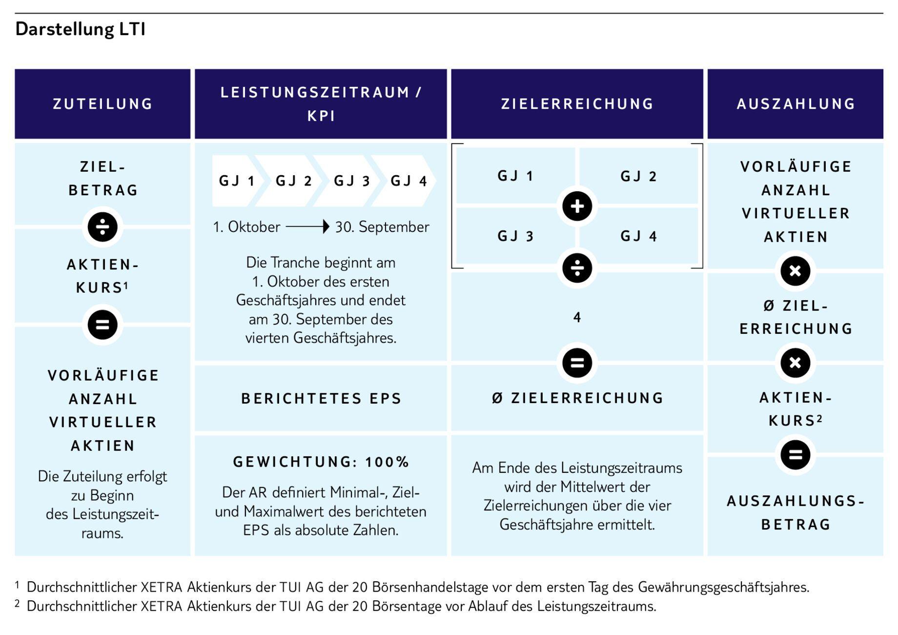Auszahlungen aus dem LTI werden nur bei einer Zielerreichung innerhalb des Zielerreichungskorridors gewährt. Die endgültige Anzahl virtueller Aktien und der Auszahlungsbetrag werden am Ende des Leistungszeitraums ermittelt, basierend auf der Zielerreichung und dem durchschnittlichen XETRA-Aktienkurs der TUI AG der 20 Börsenhandelstage vor Ablauf des Leistungszeitraums.