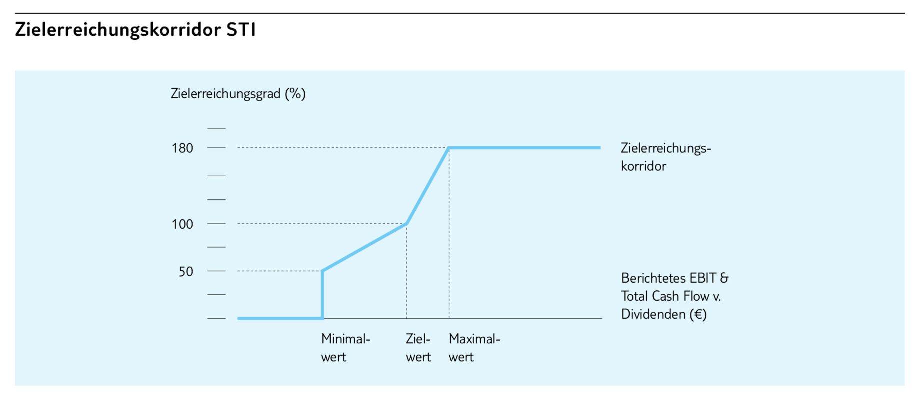 Auszahlungen aus dem STI werden nur bei einer Zielerreichung innerhalb des Zielerreichungskorridors gewährt. Der aus der gewichteten Durchschnittsberechnung resultierende Zielerreichungsgrad wird mit dem ESG-Faktor und dem im Dienstvertrag vereinbarten individuellen Zielbetrag multipliziert, um den Auszahlungsbetrag für den STI zu berechnen.
