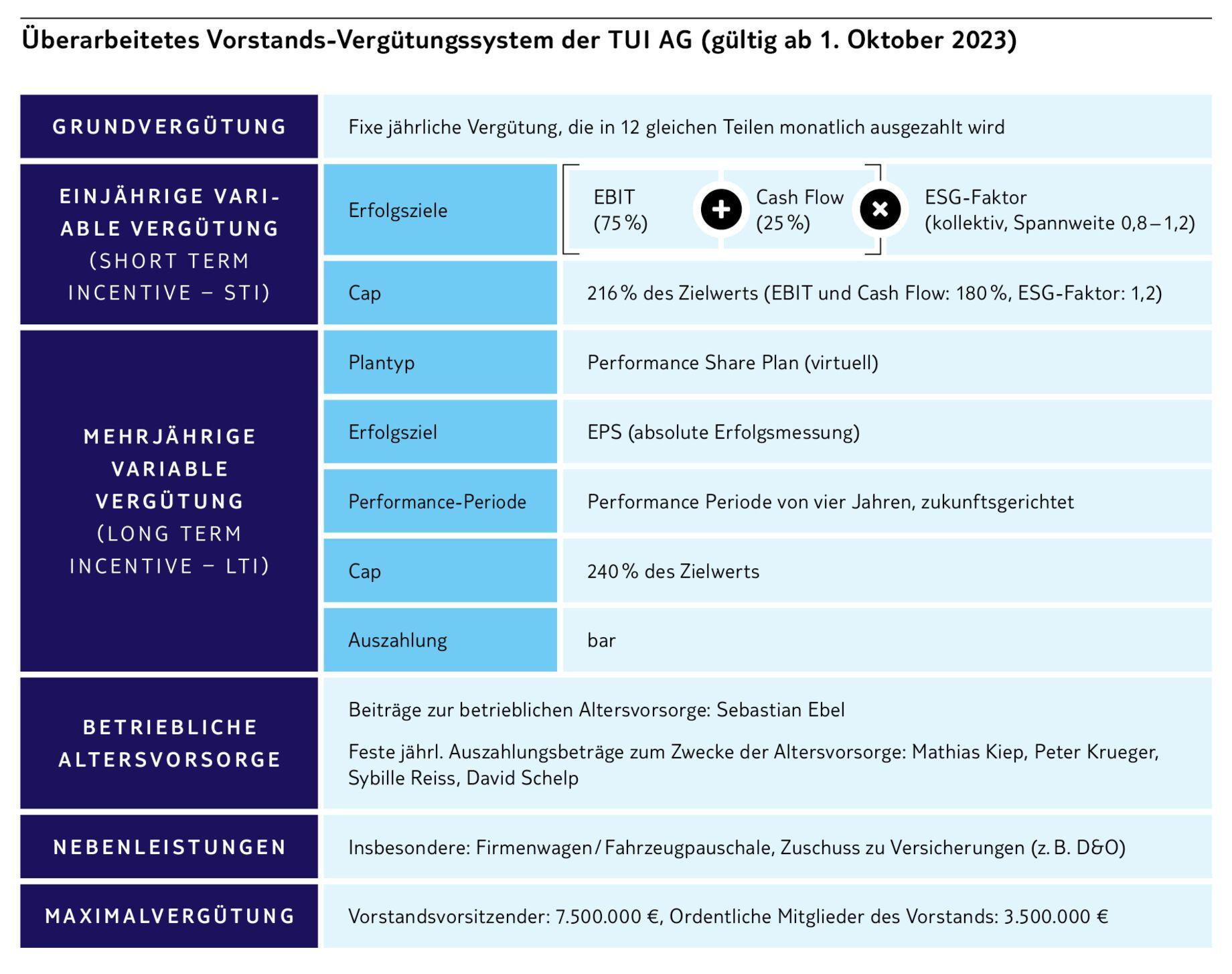 Das aktuelle Vergütungssystem für die Vorstandsmitglieder der TUI AG gilt seit dem Geschäftsjahr 2024 (Beginn am 01. Oktober 2023) und wurde von der Hauptversammlung am 13. Februar 2024 rückwirkend mit einer Mehrheit von 88,94 % gebilligt.
