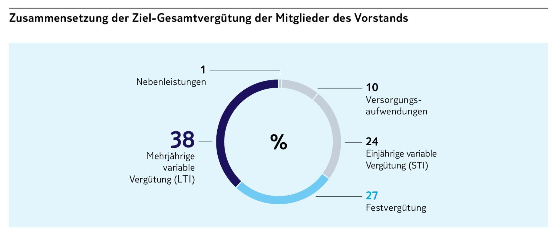 Die Vergütung des Vorstandsvorsitzenden besteht zu etwa 36% aus festen Bestandteilen und zu etwa 64% aus variablen Bestandteilen. Dabei macht der STI etwa 40% und der LTI etwa 60% der variablen Vergütung aus. Bei den anderen Vorstandsmitgliedern liegt der Anteil der festen Vergütung bei etwa 40-45% und jener der variablen Vergütung bei etwa 55-60%. Der Anteil des STI an der variablen Vergütung liegt bei etwa 35-38% und der des LTI bei etwa 62-65%. Die Anteile der festen und variablen Vergütung können in zukünftigen Geschäftsjahren variieren, insbesondere aufgrund von Entwicklungen der Service Costs im Rahmen der betrieblichen Altersversorgung, des Aufwands für vertraglich zugesagte Nebenleistungen und durch eventuelle Neubestellungen.