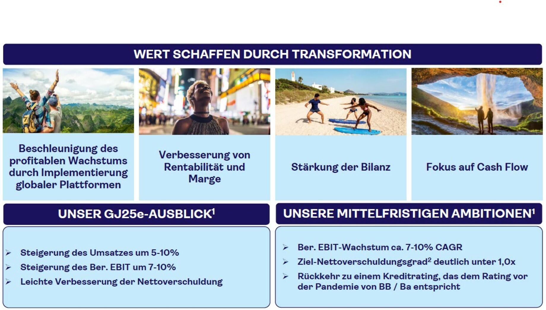Wir konzentrieren uns weiterhin auf operative Exzellenz, Umsetzung und Transformation mit dem Ziel profitables Wachstum zu erzielen. Unser strategischer Fahrplan, die bisher erzielten operativen Verbesserungen und die Maßnahmen zur Stärkung unserer Bilanz bilden die Grundlage für die Erreichung unserer Ziele. Unsere Prognose basiert dabei auf weiterem nachhaltigem Wachstum im Segment Urlaubserlebnisse so wie der Transformation des Geschäftsbereichs Märkte + Airline. Diese wird durch unsere derzeitige positive Buchungsdynamik unterstützt. Auf dieser Basis freuen wir uns, die folgende Prognose für das Geschäftsjahr 2025 abzugeben: