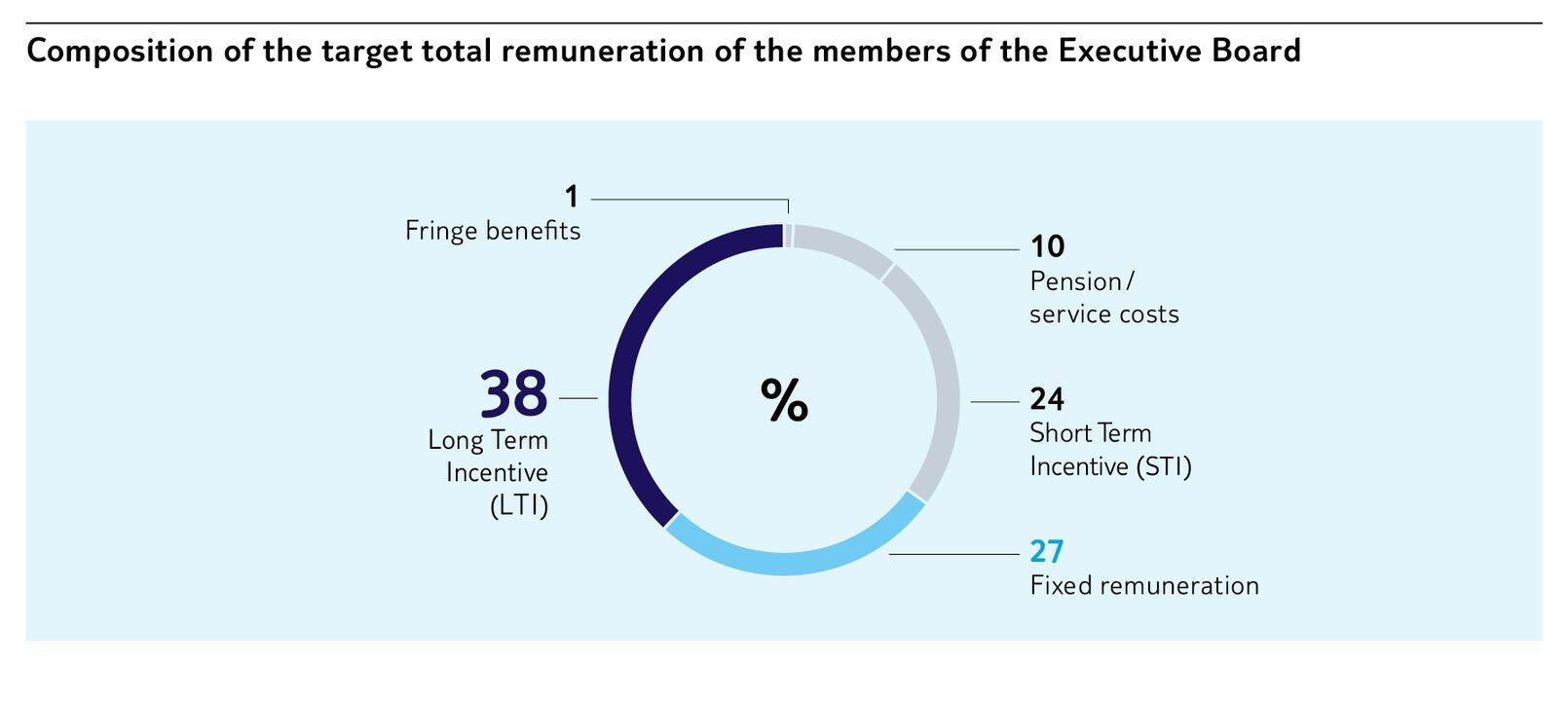 Around 36% of the CEO's remuneration consists of fixed components and around 64% of variable components. The STI accounts for around 40% and the LTI for around 60% of the variable remuneration. For the other members of the Executive Board, the proportion of fixed remuneration is around 40-45% and that of variable remuneration around 55-60%. The STI accounts for around 35-38% of variable remuneration and the LTI for around 62-65%. The proportions of fixed and variable remuneration may vary in future financial years, in particular due to developments in service costs as part of the company pension scheme, the cost of contractually agreed fringe benefits and any new appointments.